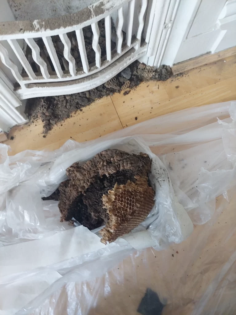 Our final job of the day was a bit more delicate. A family had flies coming down from a unused chimney after a bit of head scratching and with the use of our chimney brushes we removed a old bees nest from the stack no bees were present but there was honey hence the fruit flies Unlike wasps, bees are generally non-aggressive and are crucial pollinators, so our approach needed to be gentle and environmentally conscious.